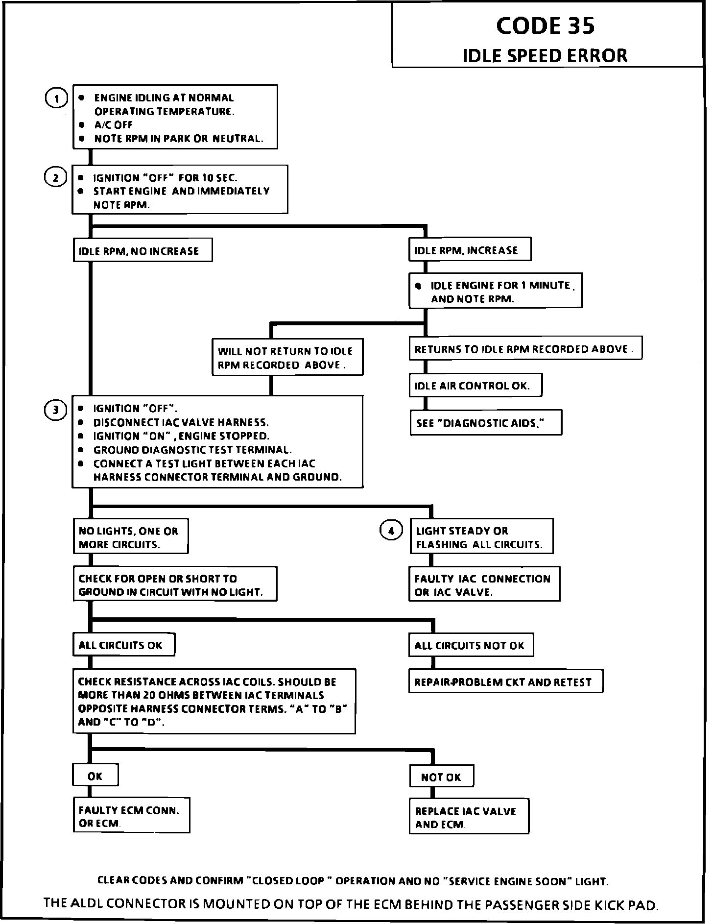 A Code 35 will set when the engine speed is 175 rpm above or below the desired idle speed for 20 seconds. The ECM controls engine idle speed with the Idle Air Control (IAC) valve. Voltage pulses are sent to the proper motor windings to control the IAC motor. ECM pulses are referred to as "counts." To increase idle speed, the ECM retracts the IAC valve pintle away from its seat, allowing more air to pass by the throttle body. To decrease idle speed, it extends the IAC valve pintle towards its seat, reducing bypass air flow. A "Scan" tool will read the ECM commands to the IAC valve in counts. The higher the counts indicate more air bypass (higher idle). The lower the counts indicate less air is allowed to bypass (lower idle).