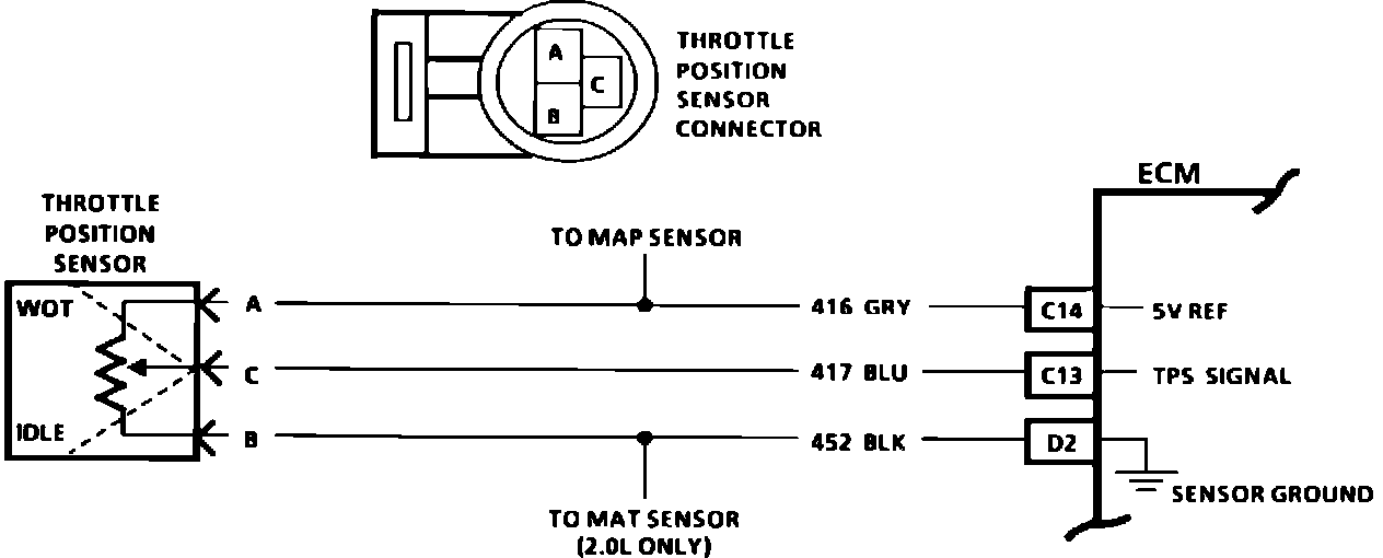 The Throttle Position Sensor (TPS) provides a voltage signal that changes relative to the throttle blade angle. Signal voltage will vary from about 1.25 volts at idle, to about 4.5 volts at Wide Open Throttle (WOT). The TPS signal is one of the most important inputs used by the ECM for fuel control, and for most of the ECM controlled outputs.