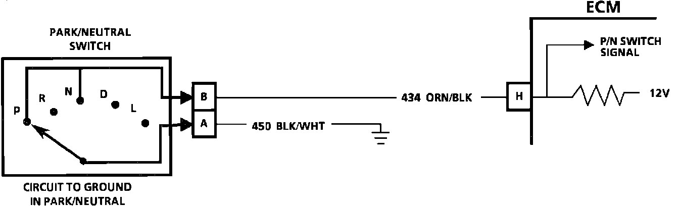The P/N switch is connected to the transmission gear selector. The switch is closed when the gear selector is in park or neutral and open for all other ranges. One side of the switch is connected to the ECM, which supplies a buffered 12 volts. The other side of the switch is connected to ground. The P/N switch state is an input to the ECM. Low voltage at ECM terminal "H" indicates the transmission is in park or neutral range while high voltage indicates it is in a drive range or reverse.