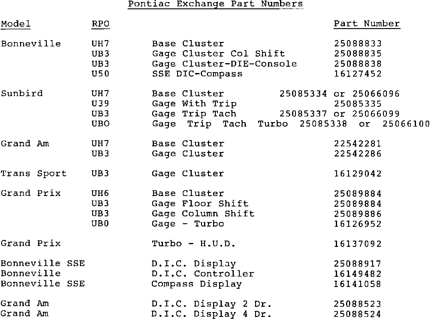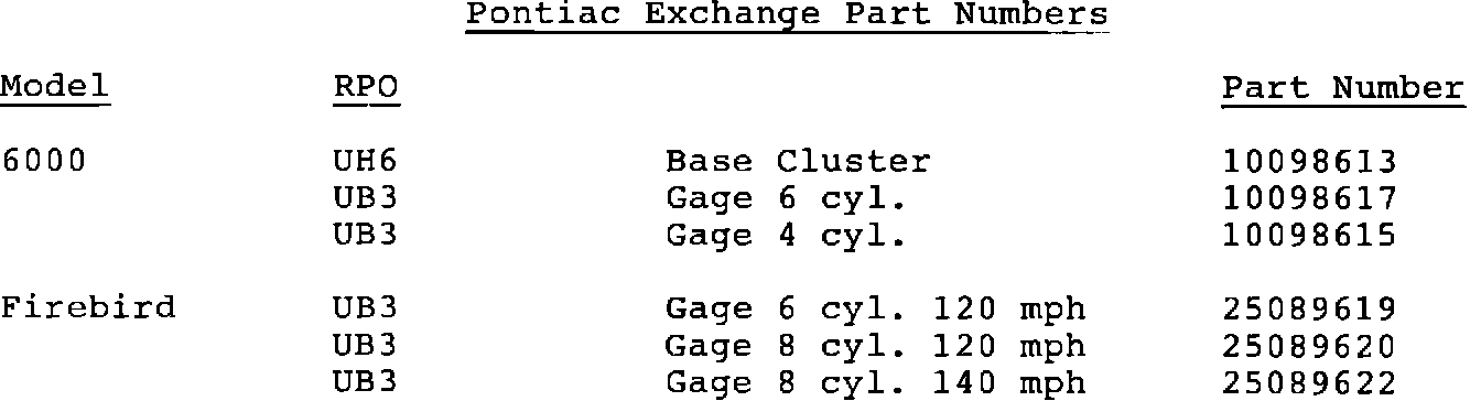 Instrument clusters are serviced by the exchange units listed in this bulletin. Part numbers and applications are listed below.