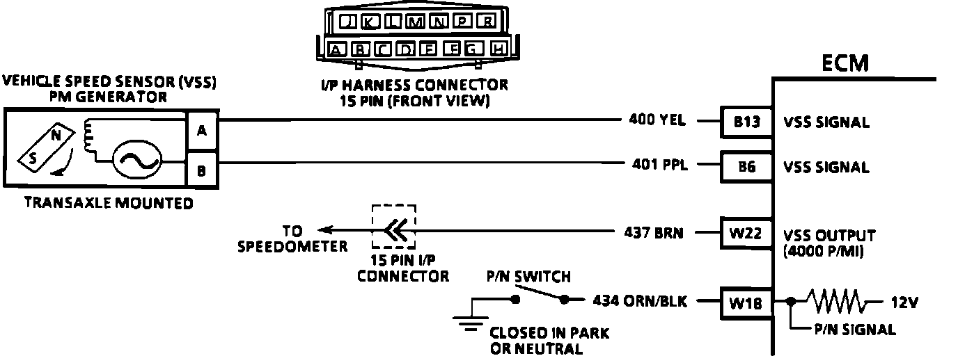 Vehicle speed information is provided to the ECM by the Vehicle Speed Sensor (VSS). It is a Permanent Magnet (PM) generator and is mounted in the transmission. The generator produces a pulsing voltage whenever the vehicle speed is over 3 mph. The voltage level and number of pulses increase as the vehicle's speed increases. The ECM converts the pulse voltage into miles per hour. This data is used for calculations and can be displayed on the "Scan" tool. The function of the VSS buffer has been incorporated into the ECM. The ECM supplies the signal for the instrument panel, 4000 pulses per mile, for operating the odometer and speedometer.