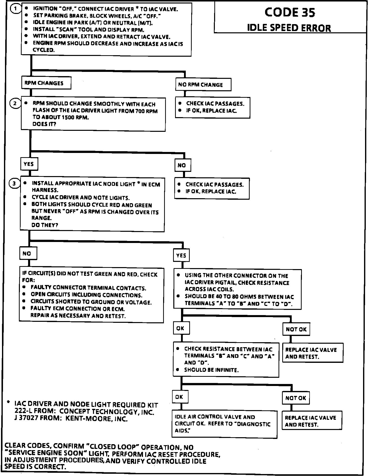 3. Steps 1 and 2 verified proper IAC valve operation. This step checks the IAC circuit. Each lamp on the node light should flash red and green while the IAC valve is cycled. While the sequence of colors are not important, if either the light is "OFF" or does not flash red and green, check the circuits for faults. Check for poor terminal contacts.