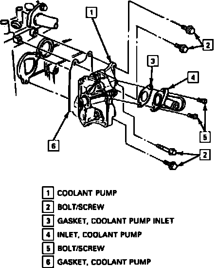 2. Remove alternator, then disconnect radiator and heater hoses from inlet.