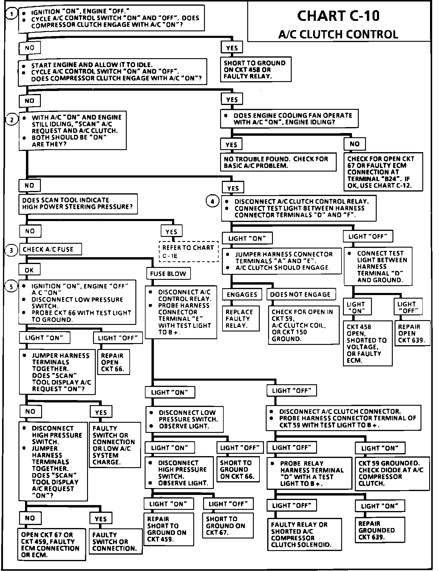 When an A/C mode is selected on the A/C control switch, ignition voltage is supplied to the compressor low pressure switch. If there is sufficient system pressure, the low pressure switch will be closed and will complete the circuit to the high pressure cut-off switch and to circuits 67 and 459. The voltage on circuit 459 to the ECM is shown on the Scan tool as "ON" (voltage present) or "OFF" (no voltage). When a request for A/C is sensed by the ECM, the ECM will ground circuit 458 of the A/C clutch control relay. The relay will then send current to circuits 459 and 59 to engage the A/C compressor clutch. A Scan tool will display circuit 458 grounding by showing A/C clutch "ON." If the ECM sensed voltage from circuit 67, the cooling fan will be energized.