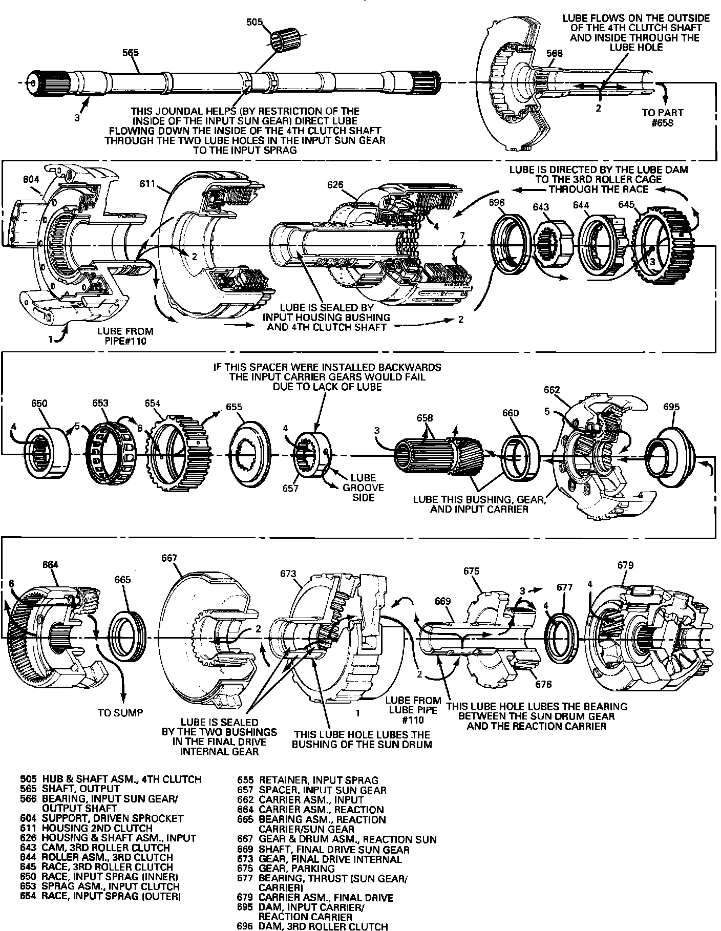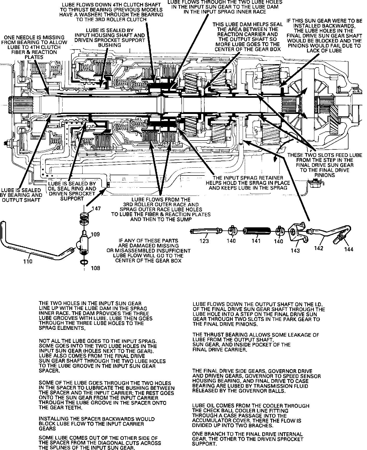 4. End Plays: If the final drive has too much clearance, this will allow the final drive sun gear to move away from the thrust bearing in the final drive. This will allow too much lube fluid to leak out from the final drive sun gear shaft - with the correct final drive end play, the sun gear would block most of the lube fluid from escaping from the sun gear shaft. If the input housing has too much clearance, this would allow too much lubrication fluid to leak out between the input bousing thrust bearing and 3rd roller clutch cam. Some leakage is designed in, but too much due to worn, damaged, missing bushings, too much end play or incorrectly installed parts could cause a durability concern.