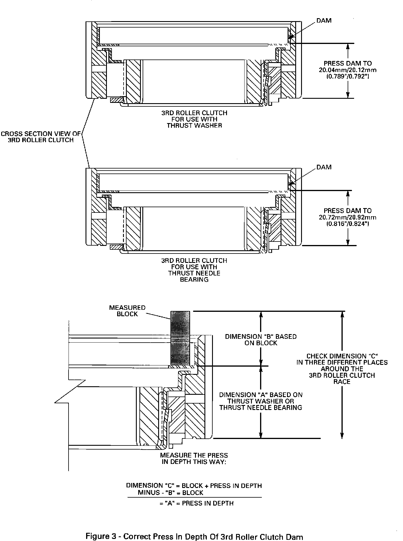 If using the thrust washer, press the dam (on models so equipped) to a depth of 20.04/20.12 mm (0.789/0.792") as measured from the bottom side (sprag side) of the outside race to the wide flat edge of the dam as shown in Figure 3.