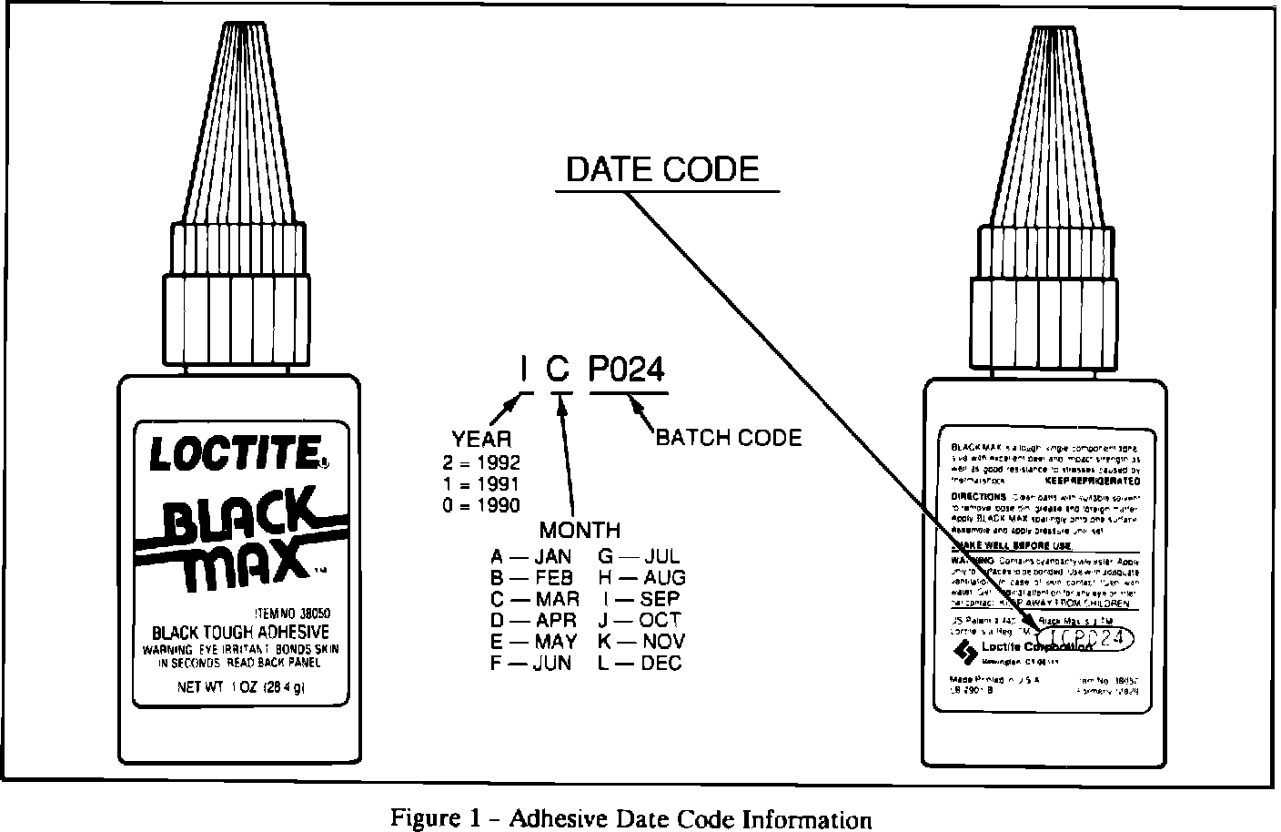 Loctite Black Max 380 Adhesive has a limited shelf life and should be refrigerated during storage. Before installing a sunroof weatherstrip seal as described in this bulletin, check the date code printed on the back label of the Loctite Black Max 380 Adhesive which is included in the weatherstrip kit. The date code, shown in Figure 1, indicates the month and year in which the adhesive was manufactured. Loctite Black Max 380 Adhesive has a shelf life of 12 months from the date of manufacture. As a result, the dealer ordering this weatherstrip seal kit is responsible for the following: