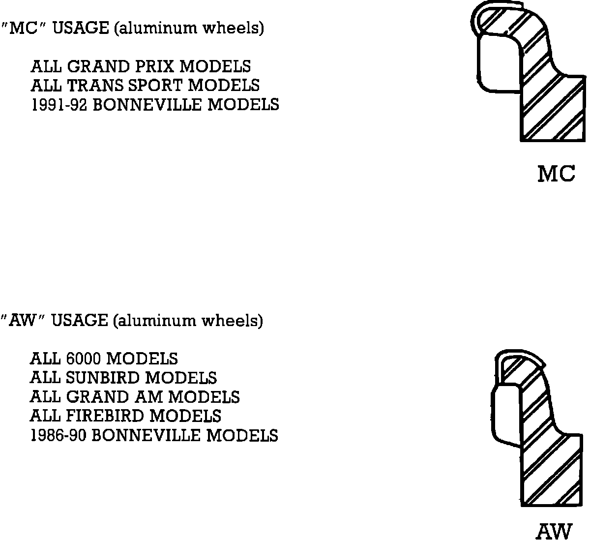 Usage of AW and MC weights on aluminum wheels by GM vehicle line is shown below. Using the incorrect type of weights will result in improper fit, and such weights may fall off the wheel. This information should be posted near the wheel balancer to aid in weight selection.