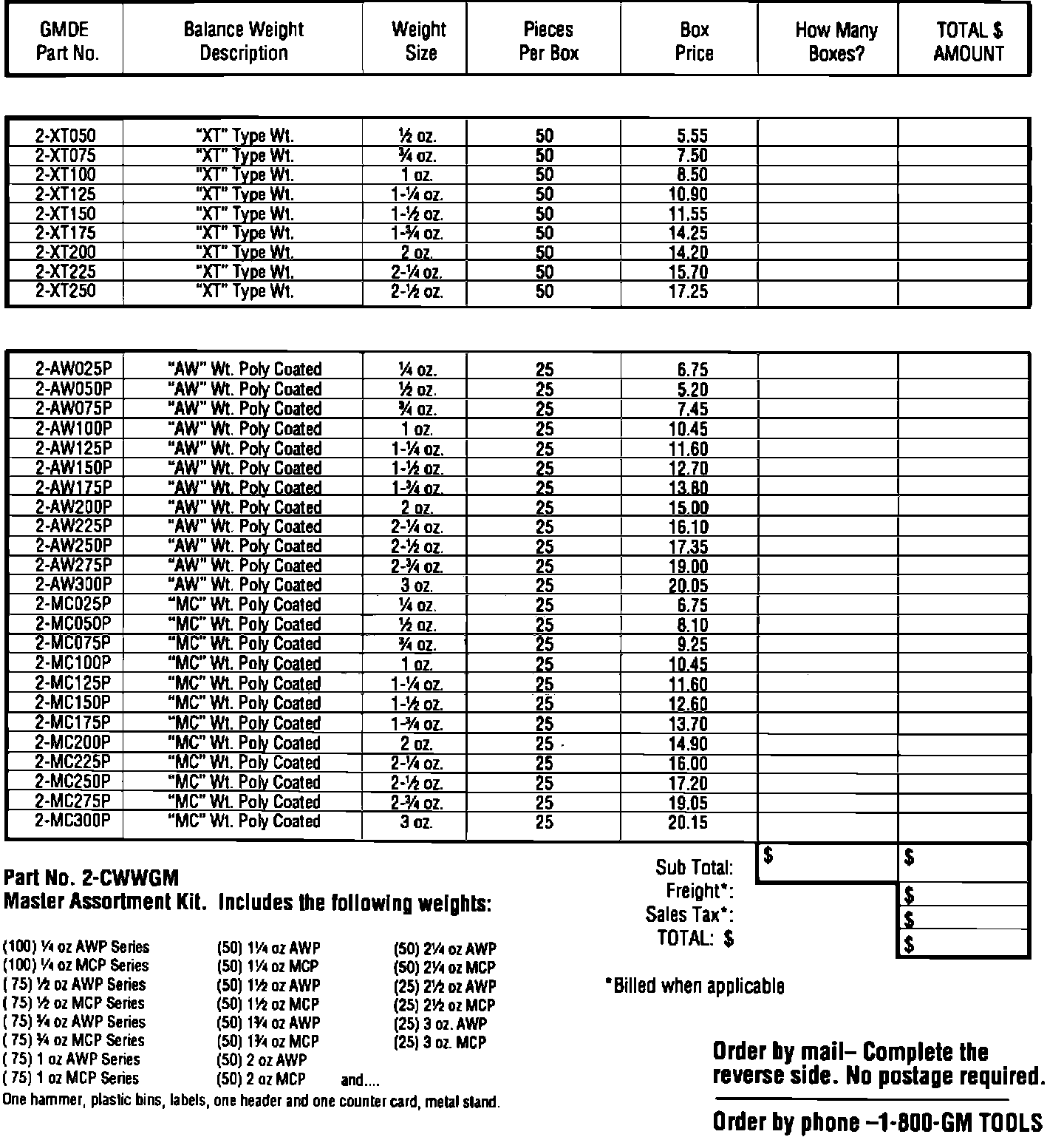 Wheel balance weights are now available through GM Dealer Equipment at a very attractive price. These are original equipment weights that will assure best fit to GM original equipment wheels. The AW series and MC series of polyester coated weights are offered for aluminum wheels. IT IS IMPERATIVE THAT COATED WEIGHTS BE USED ON ALUMINUM WHEELS TO PREVENT COSMETIC DAMAGE TO THE WHEEL. A plastic tipped hammer should also be used to prevent damage to the weight's coating during installation.