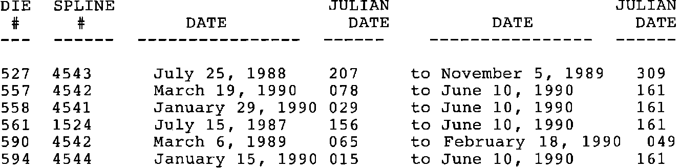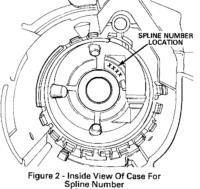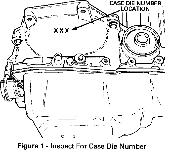 If the transaxle exhibits any of the symptoms discussed in this bulletin, inspect the case die number as shown in Figure 1 and the transaxle Julian Date. If the case die number matches the suspect numbers and the transaxle Julian Date is after the dates listed, disassemble the transaxle and check the case spline number (Figure 2) (located deep inside the barrel of the case next to the right axle seal). If it is listed below, replace the case. If the transaxle is not a suspect unit, then refer to the Automatic Transaxle Diagnosis section of the Service Manual for repair procedures.