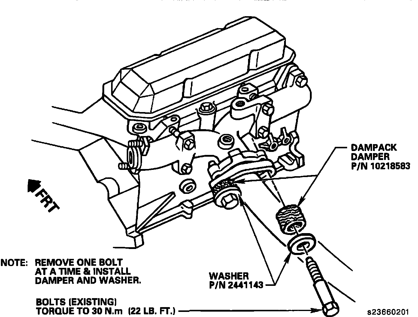 Install Dampack Dampers, P/N 10218583 (two required) and washers, P/N 2441143 (two required) in place of the existing exhaust manifold pipe springs as shown in the illustration.