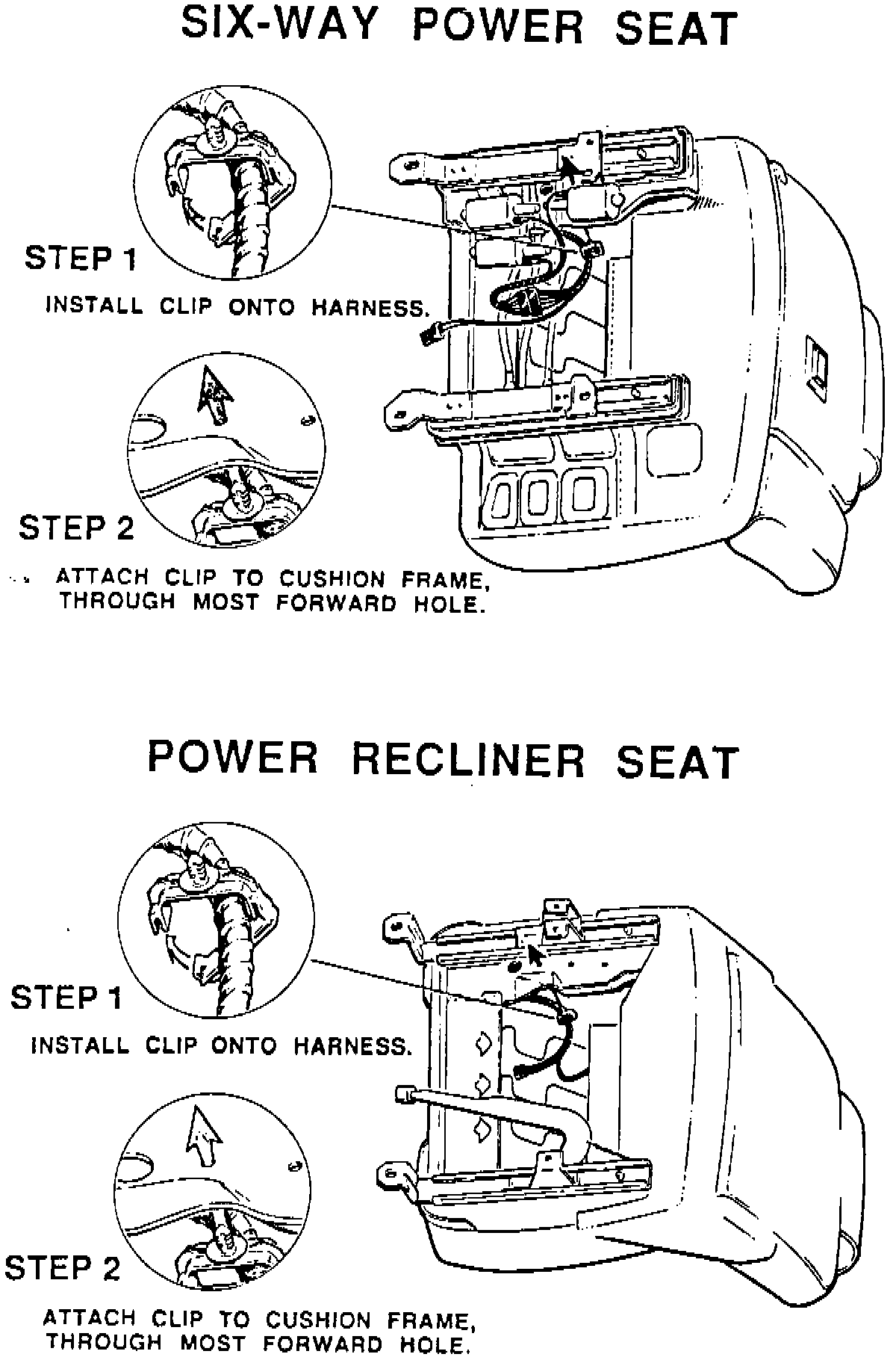 6. Install the wiring harness into clip P/N 10112015. Reroute the wiring harness through the detent and insert the clip into the forward most hole in the seat cushion frame (see Illustration).