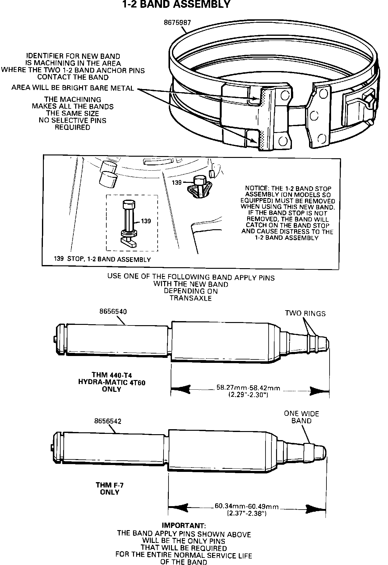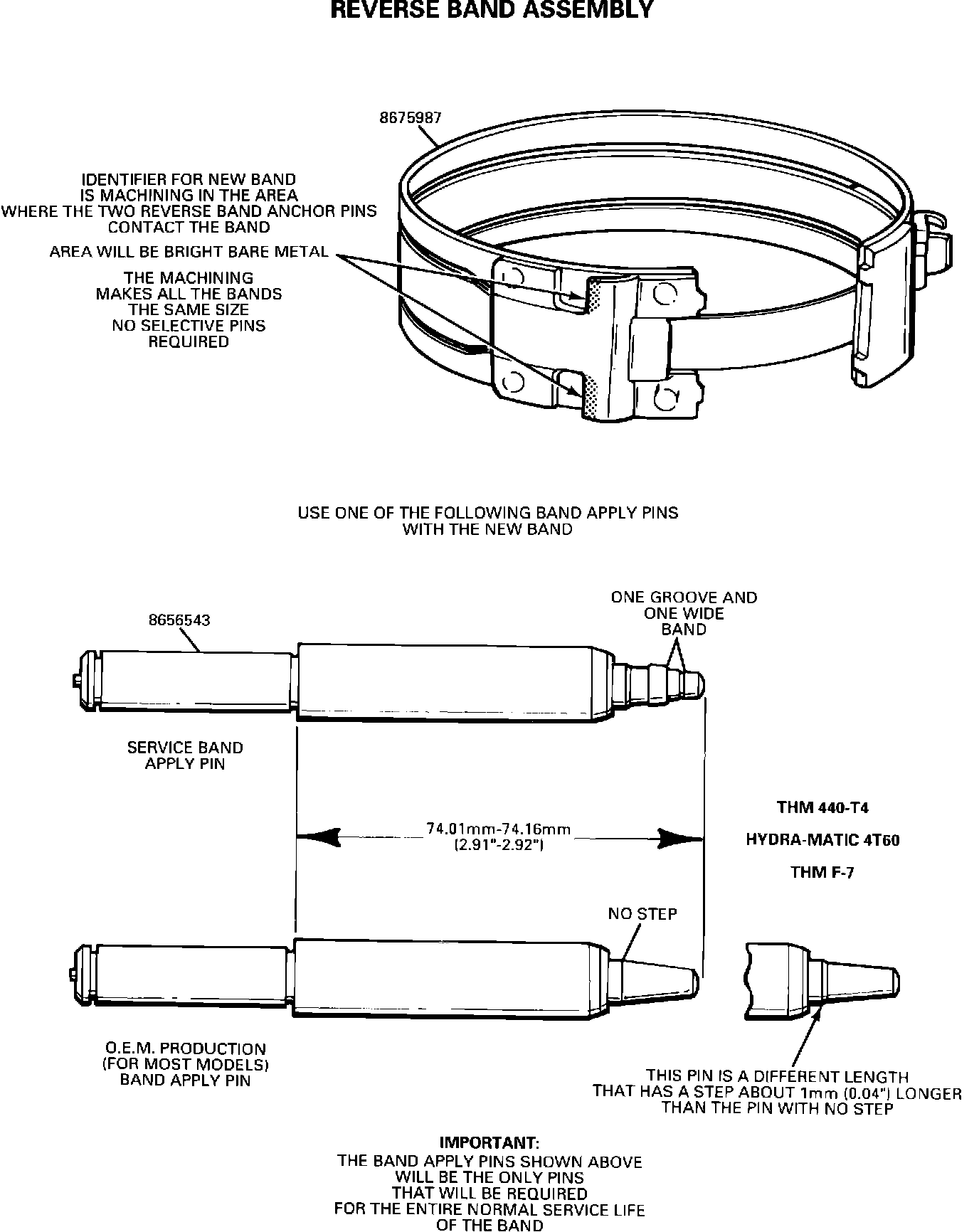 IMPORTANT: If ordering a new 1-2 or reverse band, the correct band apply pin must be used with the band. The correct band apply pin is not included with the new band service package(s) (that includes an instruction sheet about the non-selective band apply pin band). The proper band apply pin must be ordered separately.