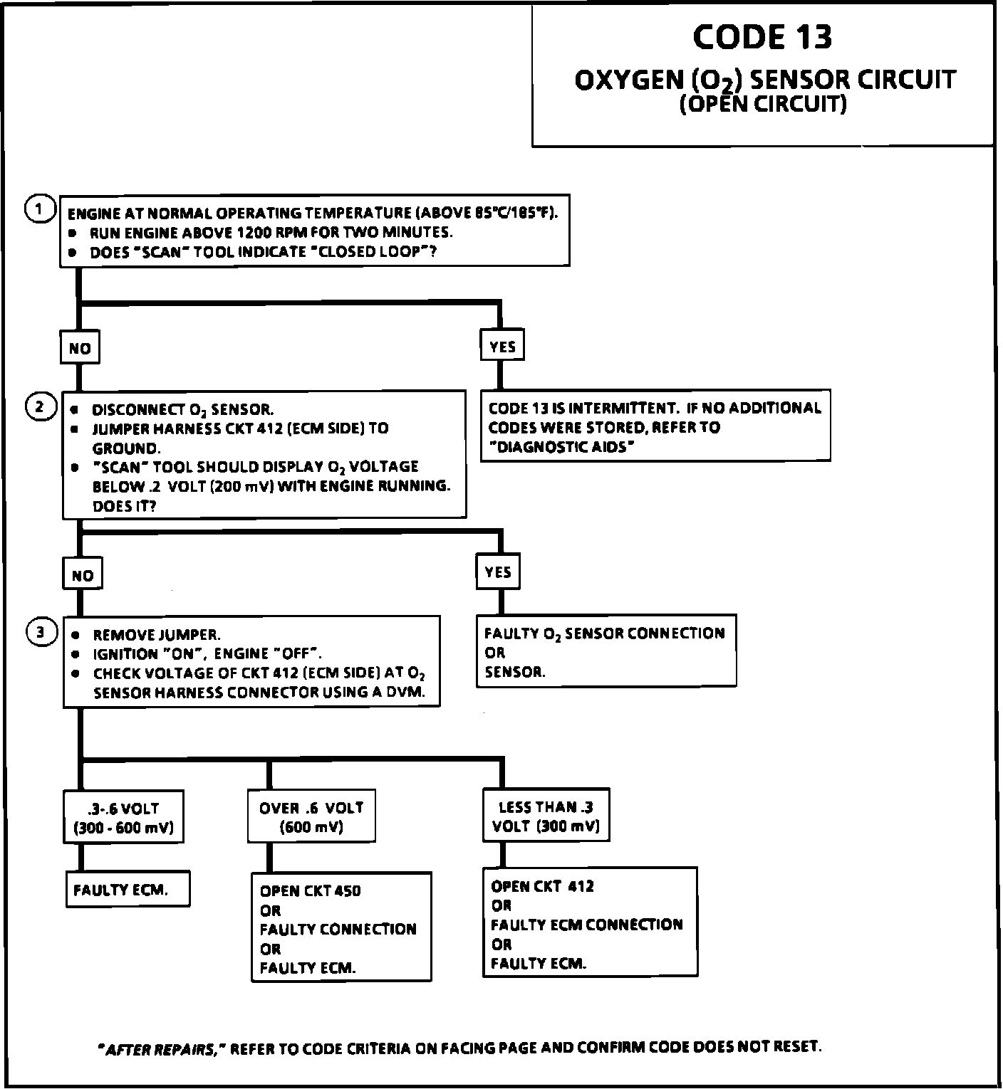 Normal "Scan" voltage varies between 100 mV to 999 mV (0.1 and 1.0 volt) while in "Closed Loop". Code 13 sets in one minute if voltage remains between 0.35 and 0.55 volt, but the system will go "Open Loop" in about 15 seconds. Refer to TESTING PROCEDURES/DIAGNOSIS BY SYMPTOM/INTERMITTENTS..