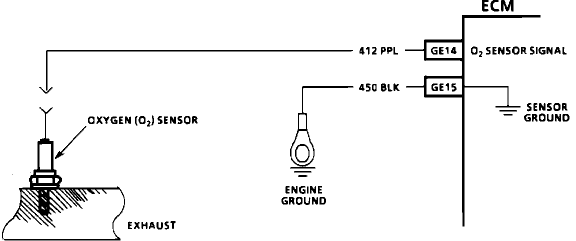 The Electronic Control Module (ECM) supplies a voltage of about 0.45 volt between terminals "GE14" and "GE15." (If measured with a 10 megohm digital voltmeter, this may read as low as 0.32 volt.) The O2 sensor varies the voltage within a range of about 1 volt if the exhaust is rich, down through about 0.10 volt if exhaust is lean. The sensor is like an open circuit and produces no voltage when it is below 316~C (600~F). An open sensor circuit or cold sensor causes "Open Loop" operation.