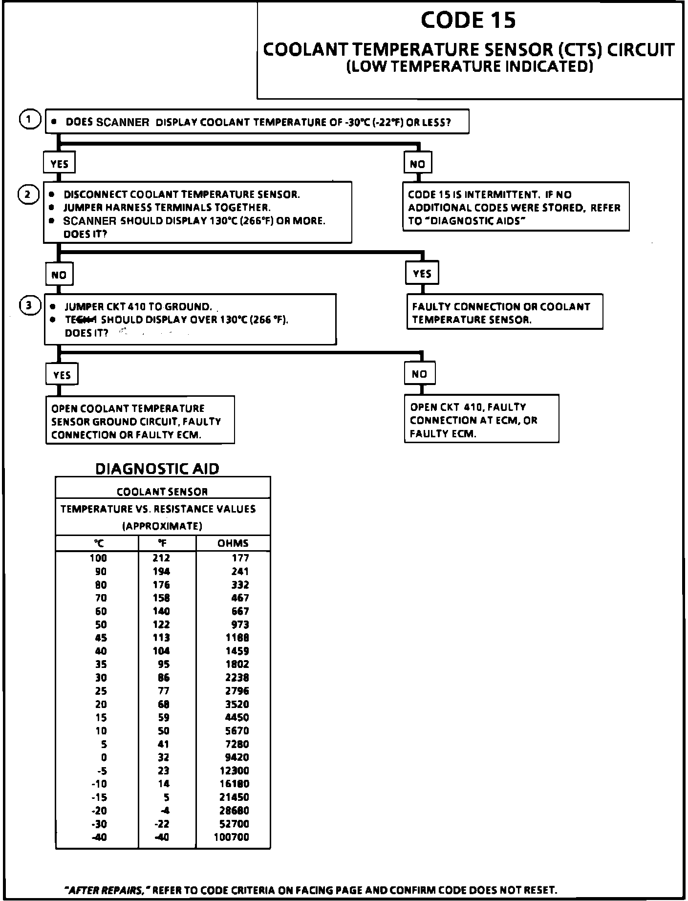 A "Scan" tool reads engine temperature in degrees centigrade. After engine is started the temperature should rise steadily to 90~C then stabilize when thermostat opens. A faulty connection, or an open circuit will result in a Code 15. If Code 21 or 23 is also set, check ground CKT for faulty wiring or connections. Check terminals at sensor for good contact. Refer to TESTING PROCEDURES/DIAGNOSIS BY SYMPTOM/INTERMITTENTS.