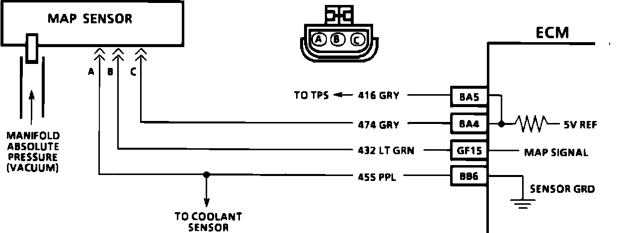 The manifold absolute pressure sensor (MAP) responds to changes in vacuum (manifold pressure). The ECM receives this information as a voltage that varies from about 1 to 1.5 volts at idle (high vacuum) to 4.5-4.8 volts at wide open throttle (low vacuum).