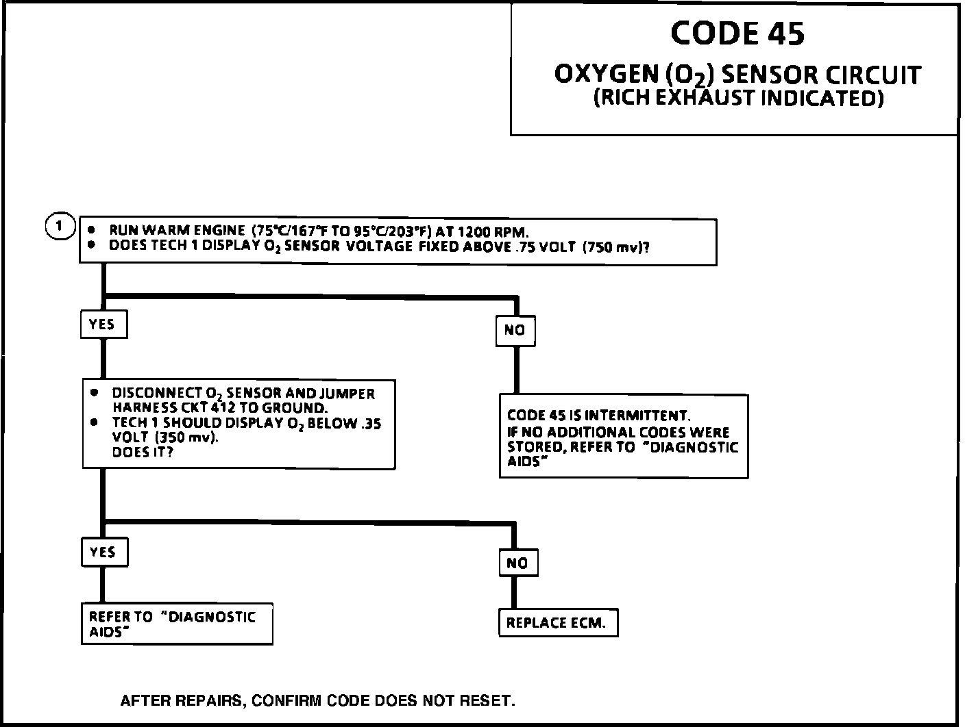 1. Code 45 is set when the O2 sensor signal voltage on CKT 412: