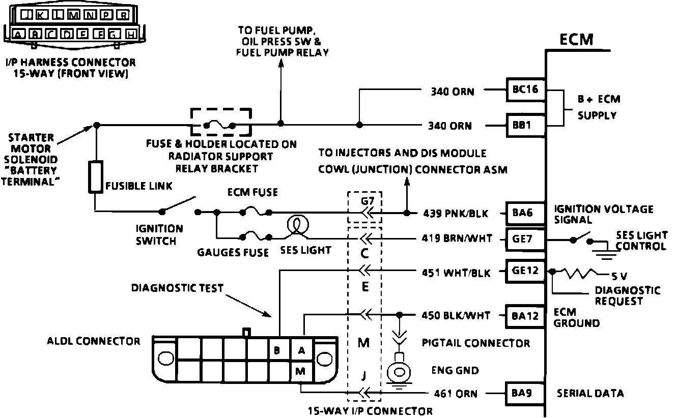 There should always be a steady "SERVICE ENGINE SOON" (SES) light when the ignition is "ON" and engine stopped. Battery is supplied directly to the light bulb. The Electronic Control Module (ECM) will control the light and turn it "ON" by providing a ground path through CKT 419 to the ECM.
