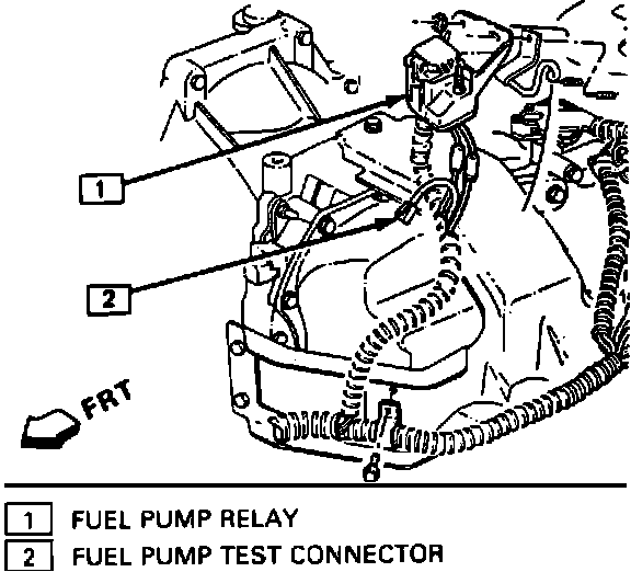 When the ignition key is first turned to the "ON" position, the ECM will energize the fuel pump relay for two seconds. This increases fuel pressure for cranking. If the engine is not running within two seconds, the ECM will shut off the relay and wait until the engine starts. As soon as the engine is cranked, the ECM will energize the relay and power the fuel pump.