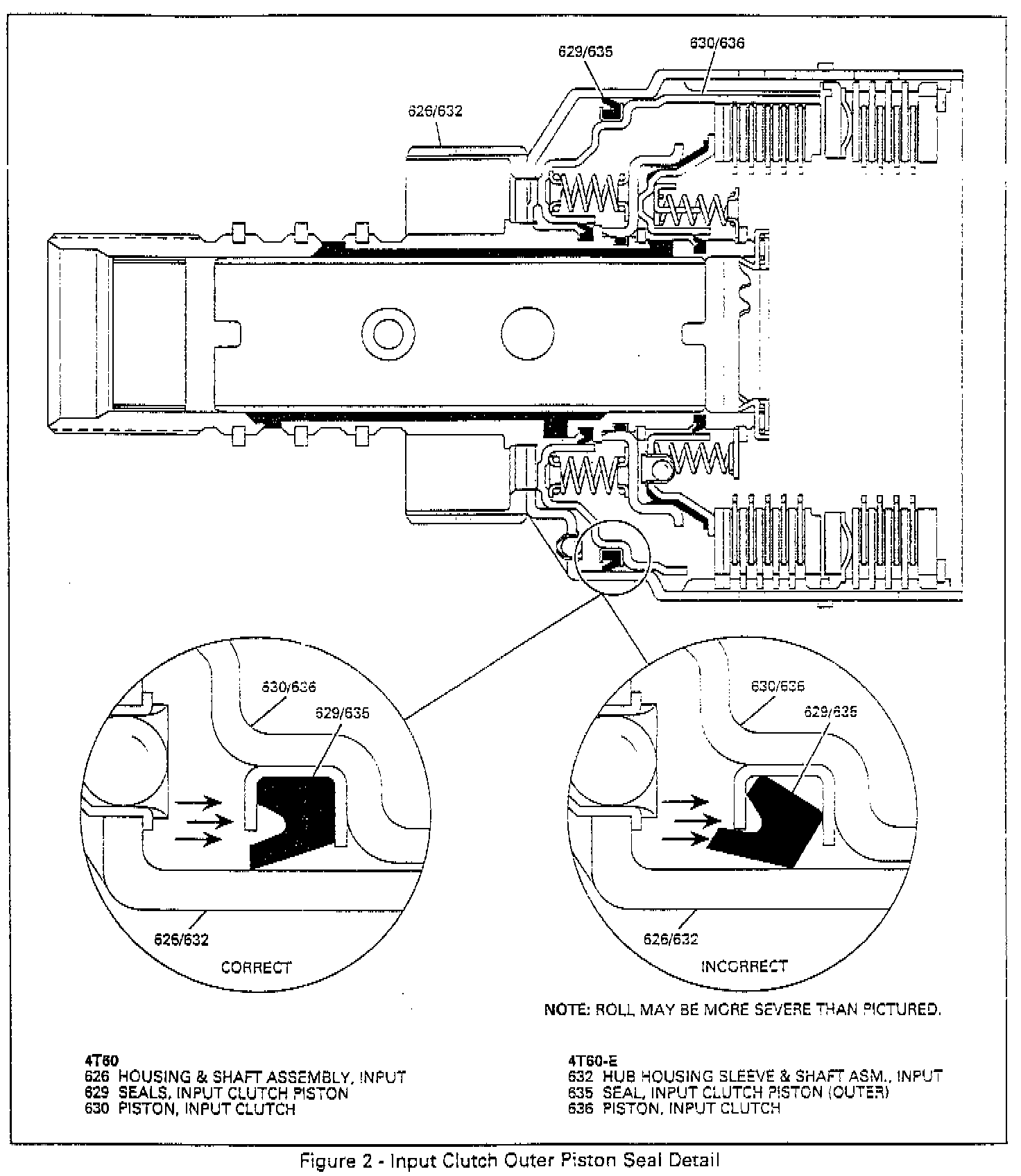An air check of the input clutch outer piston seal could be misleading, due to the position of the seal and should not be used as a factor to determine proper function. Also, the seal may look good during visual inspection but should be replaced if the above condition is present. The seal may have rolled back into the proper position during disassembly.