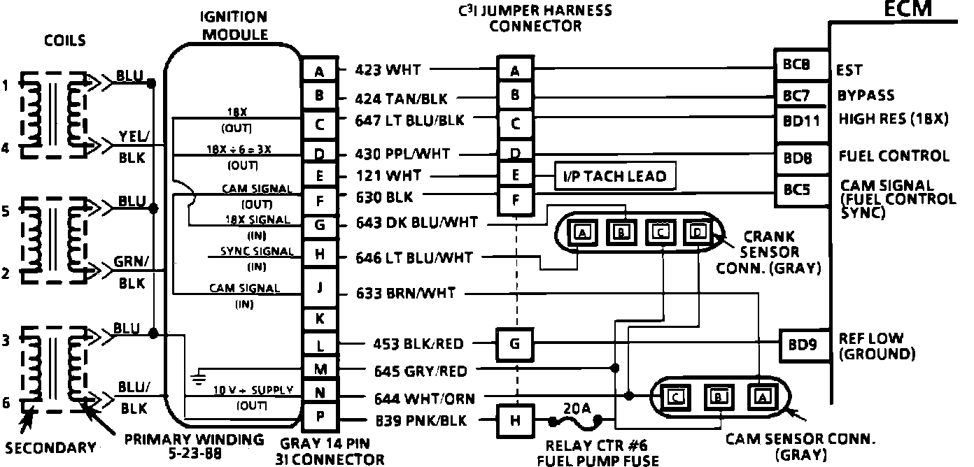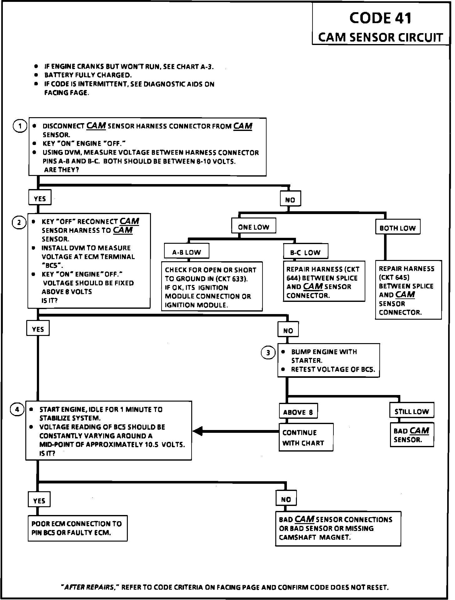 During cranking, the ignition module monitors the dual crank sensor sync signal. The sync signal is used to determine the correct cylinder pair to spark first. After the sync signal has been processed by the ignition module it sends a fuel control reference pulse to the ECM. When the ECM receives this pulse it will command all six injectors to open for a (priming) shot of fuel in all cylinders. After the priming, the injectors are left "OFF" for the next six fuel control reference pulses (two crankshaft revolutions) from the ignition module. This allows each cylinder a chance to use the fuel from the (priming) shot. During this waiting period, a cam pulse will have been received by the ECM. Now the ECM begins to operate the injectors sequentially, based on true camshaft position. However, if the cam signal is not present at start-up a code 41 will be set and the ECM will start sequential fuel delivery in any old random pattern. The engine has a 1 in 6 chance that fuel delivery is correct.