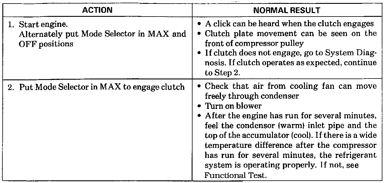 - Refer to and complete the System Diagnosis / Procedures / A/C System Functional Test as a guide to normal operation of the entire A/C System. Testing and Inspection