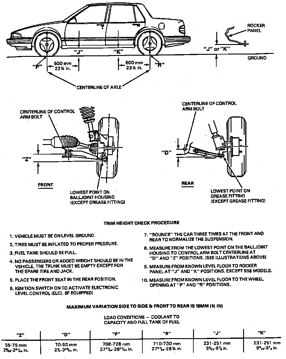 Trim heights are checked with tires at recommended pressure, fuel tank at capacity, front seat in rear position, no passengers and trunk empty, except for spare tire and jack.