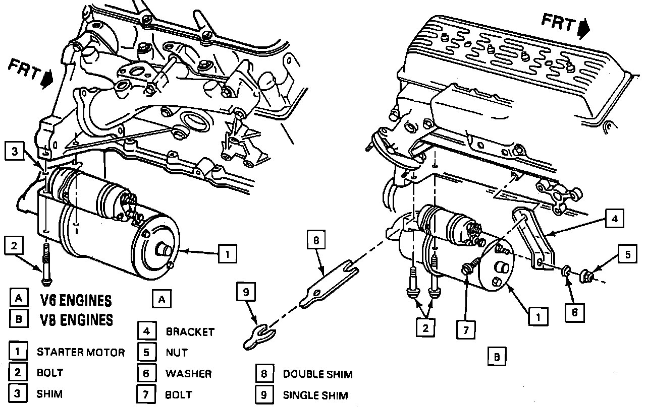 If shims are used between starter and engine block, they should be placed in their original location during installation. If starter is noisy during cranking, remove one .015 inch double shim or add one .015 single shim to the outer bolt. If starter makes a high pitched whine after firing, add .015 inch double shims until noise ceases.