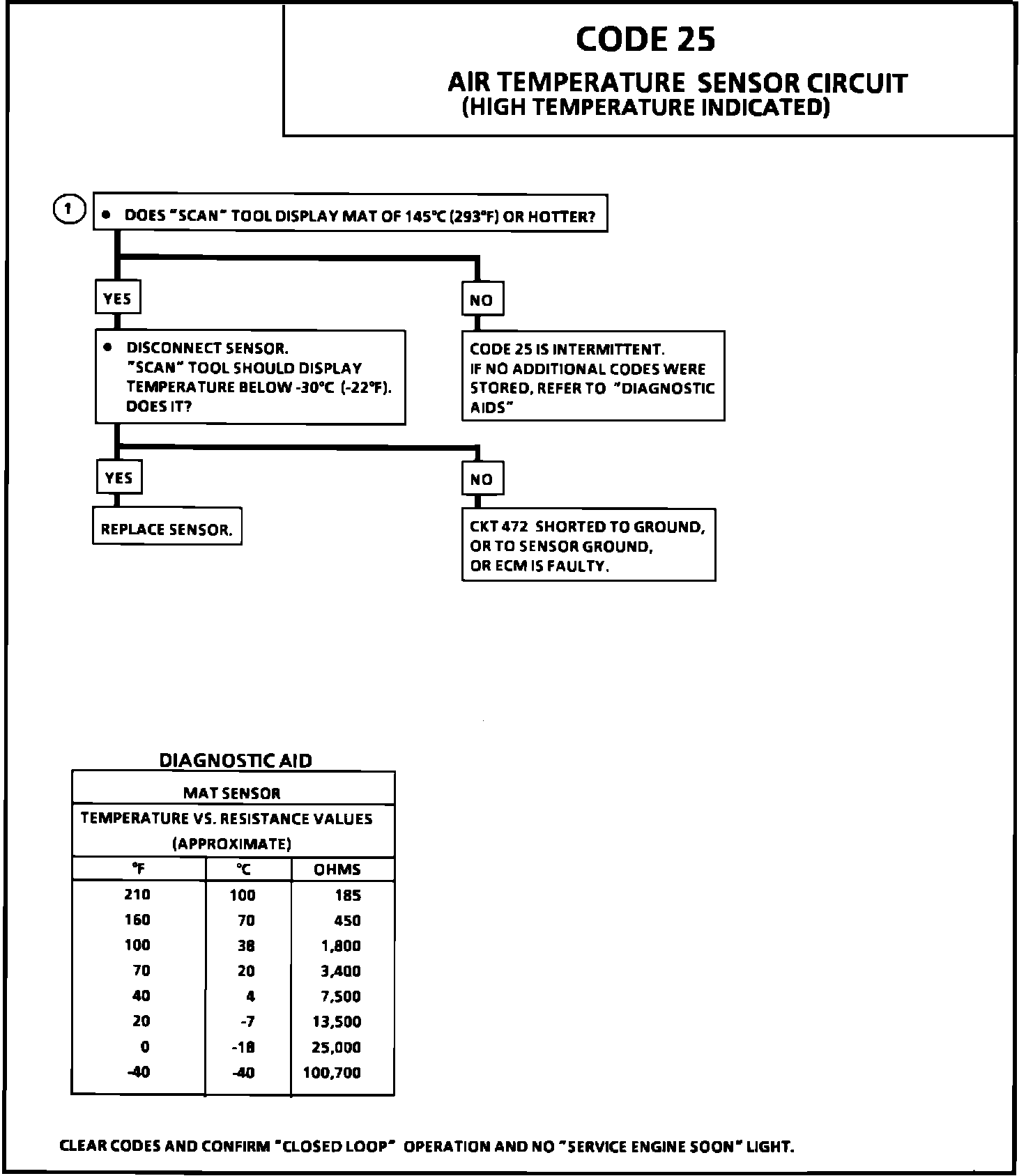 A "Scan" tool reads temperature of the air entering the engine and should read close to ambient air temperature when engine is cold, and rise as underhood temperature increases. Check harness routing for possible short to ground in CKT 472. Refer to TESTING PROCEDURES/DIAGNOSIS BY SYMPTOM/INTERMITTENTS.