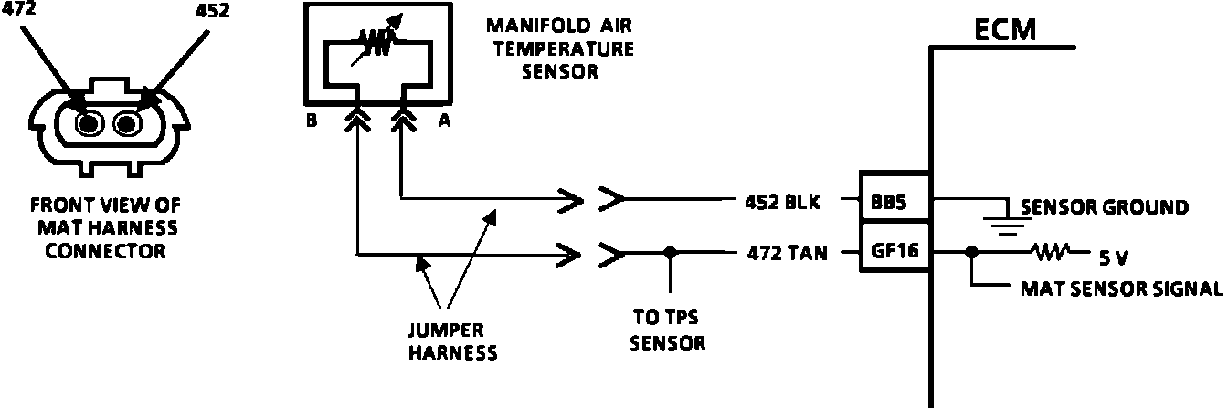 The Manifold Air Temperature (MAT) sensor uses a thermistor to control the signal voltage to the Electronic Control Module (ECM). The ECM applies a voltage (4-6) on CKT 472 to the sensor. When manifold air is cold the sensor (thermistor) resistance is high, therefore the ECM will see a high signal voltage. As the air warms, the sensor resistance becomes less, and the voltage drops.
