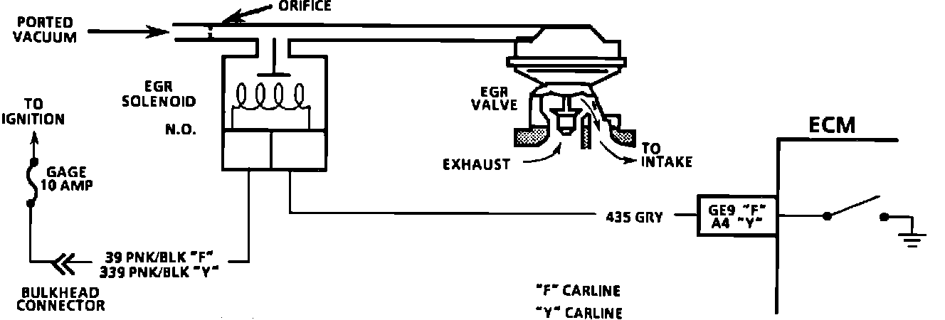 The Exhaust Gas Recirculation (EGR) valve vacuum is controlled by an Electronic Control Module (ECM) controlled solenoid. The ECM will turn the EGR "ON" and "OFF" (Duty Cycle) by grounding CKT 435. The duty cycle is calculated by the ECM based on information from the coolant temperature, air flow and engine rpm. There should be (NO EGR) when in park or neutral, Throttle Position Sensor (TPS) input below a specified value, or TPS indicating Wide Open Throttle (WOT), or the MAT sensor below 15~C (59~F). With the ignition "ON," engine stopped, the EGR solenoid is de-energized and by grounding the diagnostic terminal, the solenoid is energized.