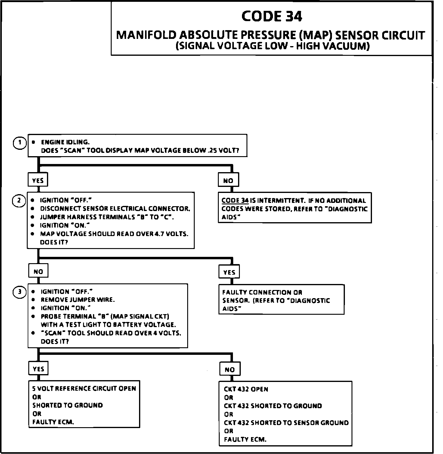 - An intermittent on circuit 432 or circuit 474 can cause a Code 34. With the ignition "ON" and the engine "OFF," the manifold pressure is equal to the atmospheric pressure and the signal voltage will be high. This information is used by the ECM as an indication of vehicle altitude and is referred to as BARO.