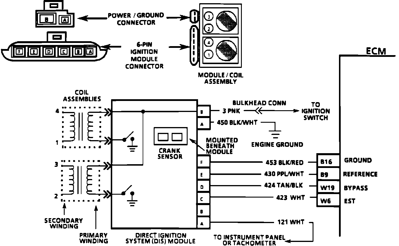 The Direct Ignition System (DIS) module sends a reference signal to the Electronic Control Module (ECM) when the engine is cranking. While the engine speed is under 400 rpm, the DIS module controls the ignition timing. When the system is running on the Ignition Module, that is, no voltage on the by-pass line, the Ignition Module grounds the Electronic Spark Timing (EST) signal. The ECM expects to see no voltage on the EST Line during this condition. If it senses a voltage, it sets a Code 42 and will not go into the EST mode. When the rpm for EST is reached (about 400 rpm), the ECM applies 5.0 volts to the by-pass line, and the EST should on longer be grounded in the ignition module so the EST voltage should be varying. If the by-pass line is open or grounded, the ignition module will not switch to EST mode so the EST voltage will be low and Code 42 will be set. If the EST line is grounded, the ignition module will switch to EST, but because the line is grounded there will be no EST signal. A Code 42 will be set.