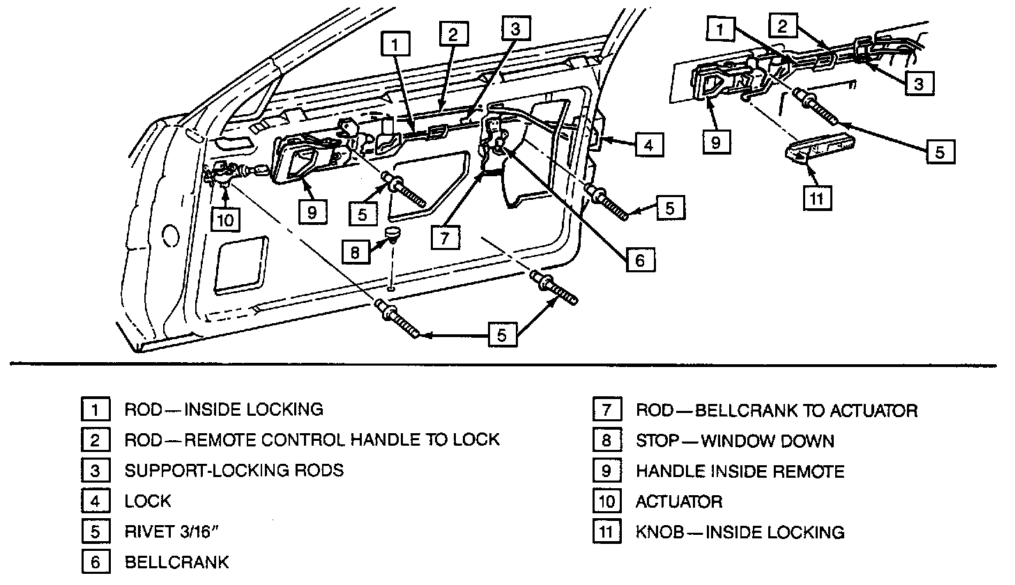 2. Actuator (10) to door inner panel using 1/4" x 1/2" aluminum peel type rivets.