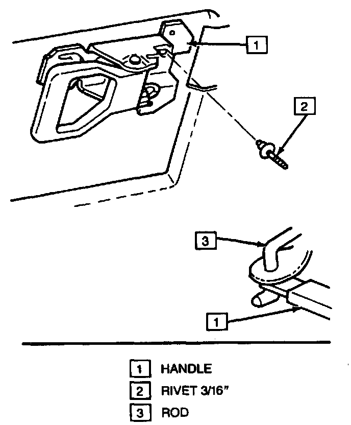 All inside remote handles are the pull-in type. All remote handles actuate the door lock through a connecting rod. Remote handles are attached to the door inner panel with rivets.