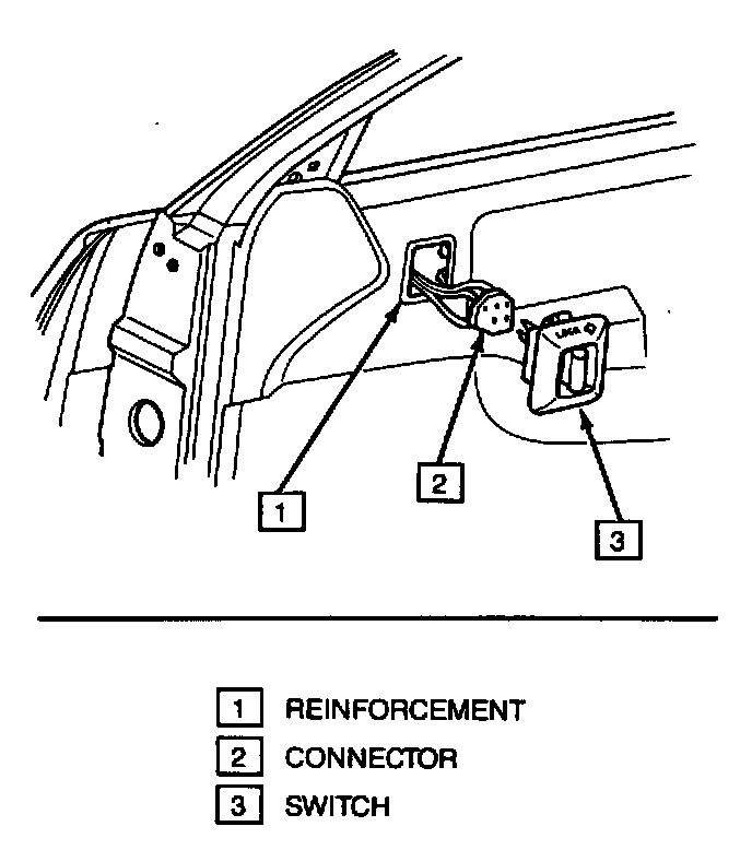 1. Release switch spring clip from trim panel by inserting a thin bladed tool between top of switch and trim panel reinforcement (1) and remove switch (3).