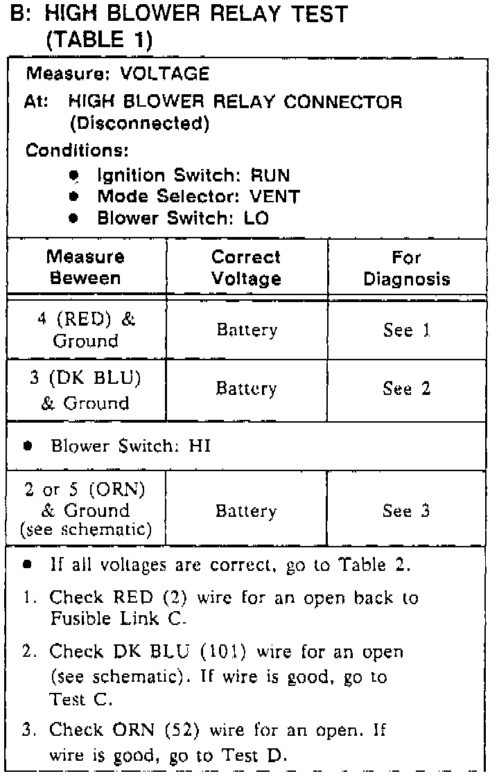 B: High Blower Relay Test - Table 1