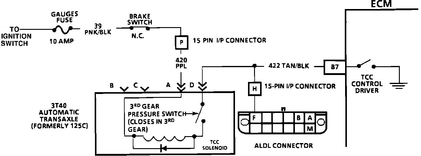 The purpose of the automatic transmission Torque Converter Clutch (TCC) feature is to eliminate the power loss of the torque converter when the vehicle is in a cruise mode. This allows the convenience of the automatic transmission and the fuel economy of a manual transmission. Fused ignition voltage is supplied to the TCC solenoid through the brake and third gear switches. The ECM will engage the TCC by grounding circuit 422 to energize the solenoid.
