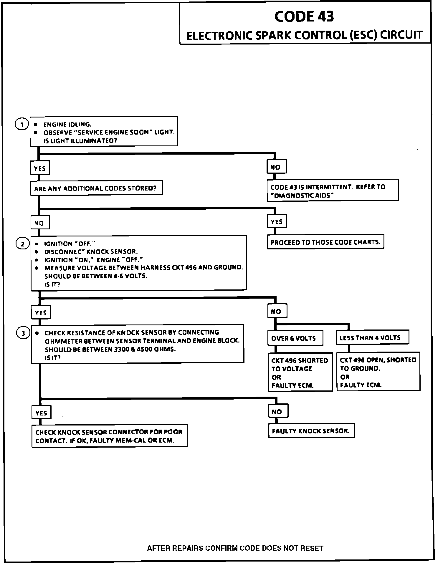 ^ If ECM terminal voltage is either above about 3.75 volts (indicating open CKT 496), or below about 1.25 volts (indicating CKT 496 is shorted to ground) for 5 seconds or more.