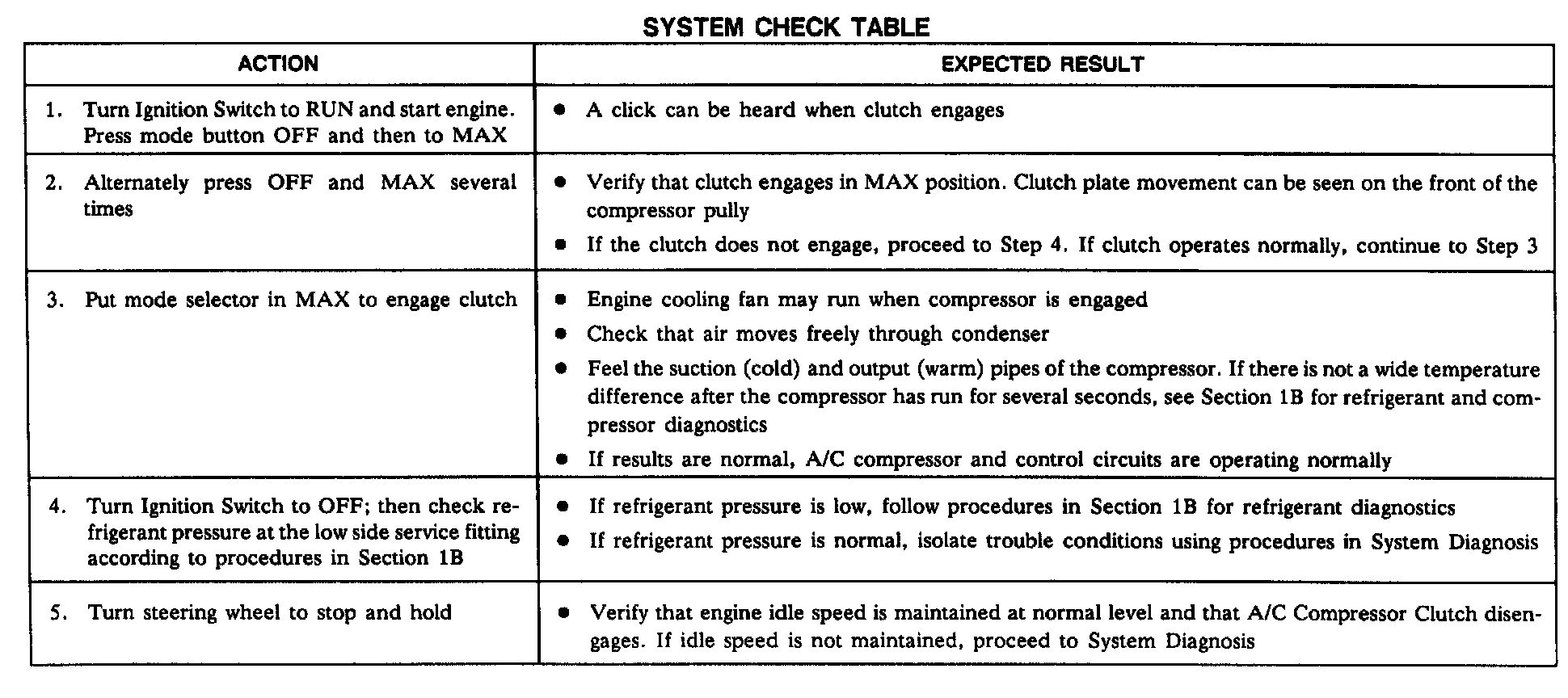 2. Use the System Check Table below as a guide to normal A/C compressor operation.