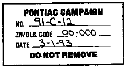 Each vehicle modified in accordance with the instructions outlined in this Product Campaign Bulletin will require a "Campaign Identification label." Each label provides a space to include the campaign number, the five digit dealer code of the dealer performing the campaign service, and the date the vehicle was campaigned. This information may be inserted with a typewriter or ballpoint pen. Install the label only on a clean, dry surface of the radiator baffle where it is readily visible. (Additional campaign labels are available on stationery order as Form 7201-709.)