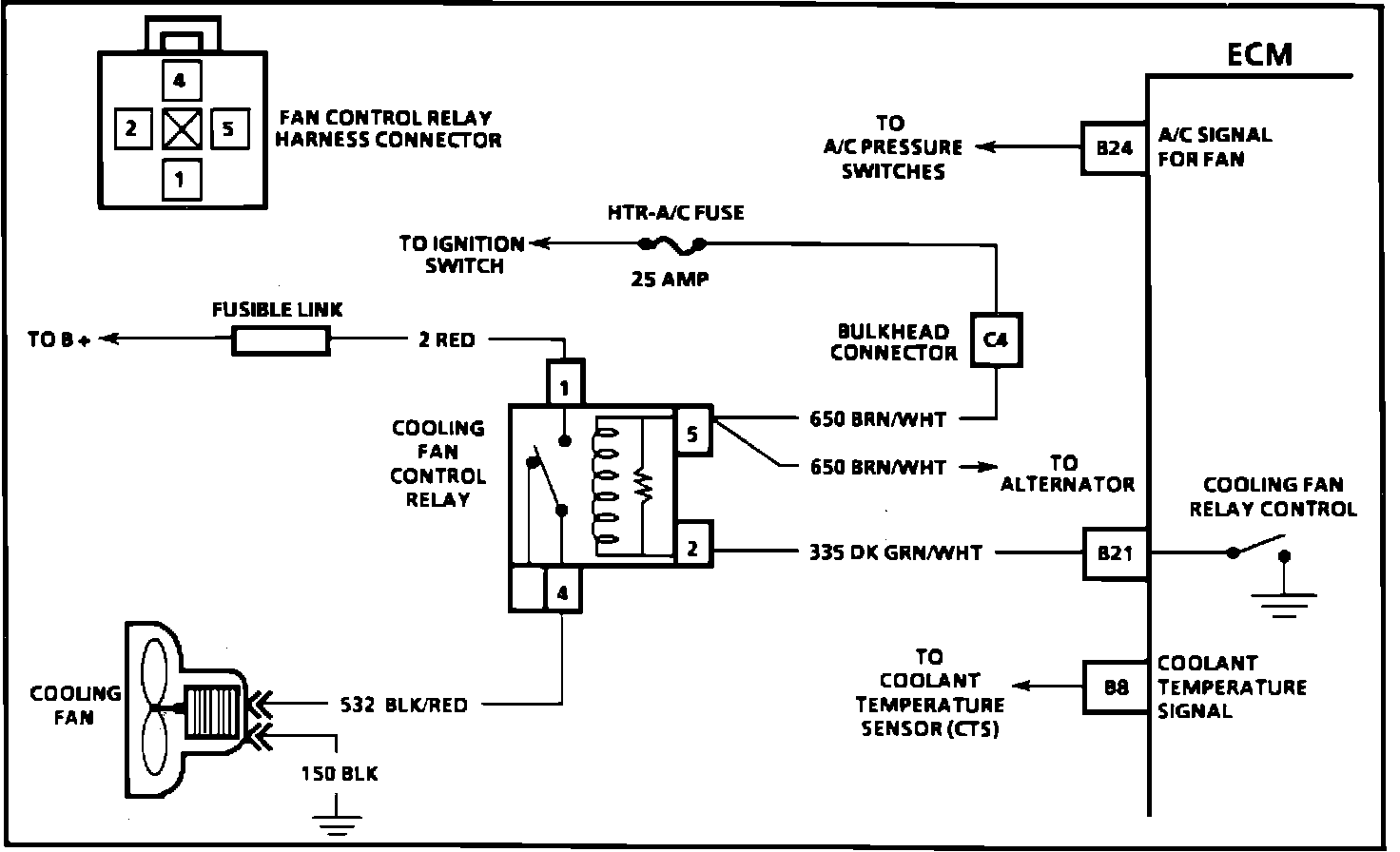 The ECM controls the engine coolant fan relay under several operating conditions. If the coolant temperature sensor indicates high engine temperature, the ECM will energize the relay to turn "ON" the fan. If the A/C is engaged, the ECM will turn the coolant fan on to cool the condenser as well as the radiator. Some fault codes will cause the ECM to turn on the fan. Above certain vehicle speeds, the ECM will de-energize the fan relay since at higher road speeds there is ample air flow.