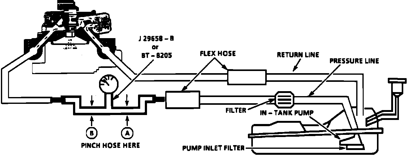 5. Connect fuel pressure gage, J-29658-B, in between the fuel feed line and the TBI unit. Use the appropriate adapters.