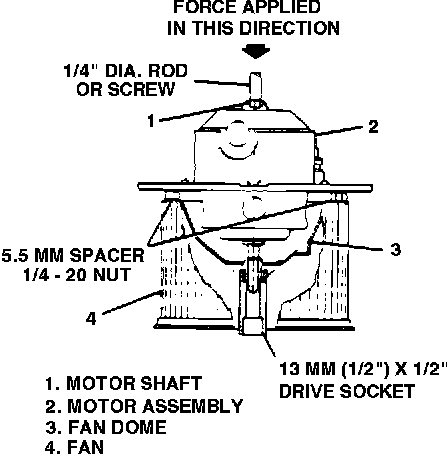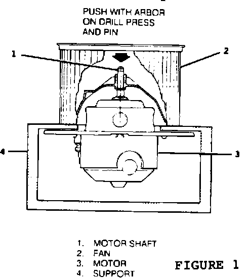 ^ Place steady pressure on tip of motor shaft as shown, with a drill press or small arbor press and pin arrangement. Motor should fall freely from the fan after moving motor shaft about 1/2 inch.
