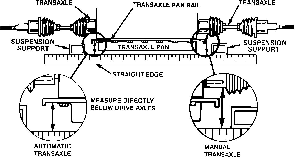 Side-to-side transaxle heights should be equal. If side-to-side differences are greater than 6 mm (1/4 inch), follow the engine shake-down procedure.