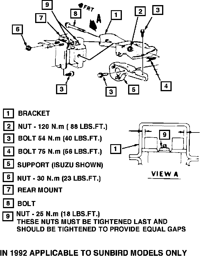 C. Block vehicle wheels and apply park and service brakes. With an assistant watching the engine, make sure the transmission mount is not grounded against the stop in drive. If so, shift the mount until the rubber stop is not contacting the mount with the engine in drive. Refer to Figure 2. (1992 Sunbird models only).