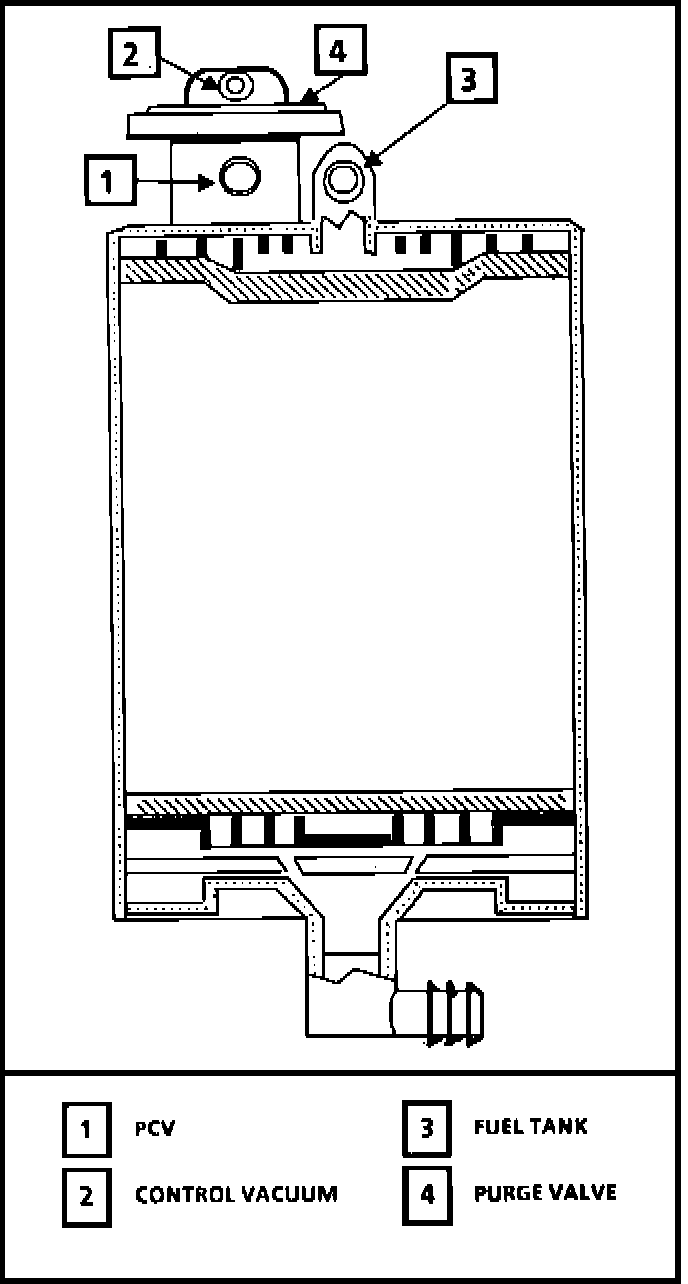 The canister has an integrated diaphragm operated purge valve. When the engine is running, manifold vacuum is supplied to the top of the purge valve (Control Vacuum Signal) which activates the valve diaphragm. The valve opens when the throttle is above a specified opening. The lower tube on the purge valve (PCV Tube) is connected to a timed port above the throttle valve. The purge rate is controlled by throttle opening position.