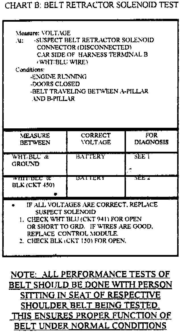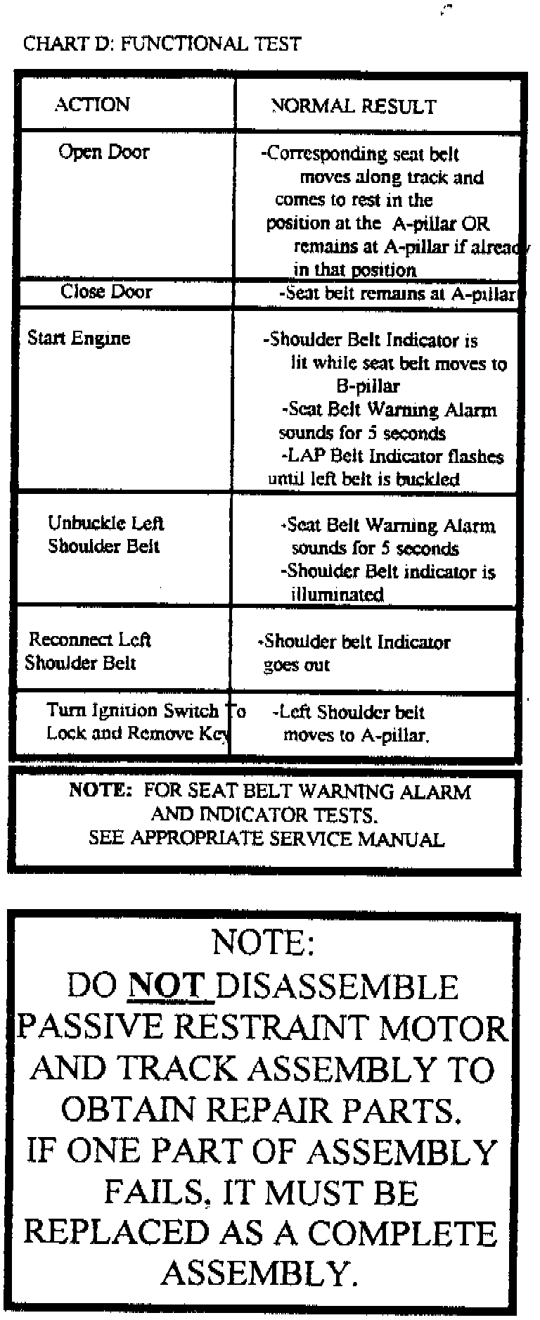 TO ASSURE PROPER FUNCTION OF THE AUTOMATIC SEAT BELT SYSTEM, PERFORM CHART D AFTER ALL REPAIRED ARE COMPLETED