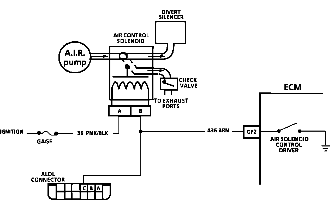 When the ECM grounds the circuit, the solenoid causes the valve to direct air to the exhaust ports. When de-energized, air diverts to the atmosphere, and air will be diverted to the ports provided that the valve has grounded at the ECM, and good manifold vacuum exists.